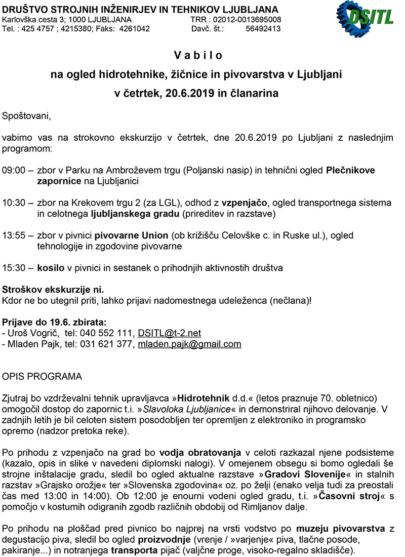 Vabilona ogled hidrotehnike, žičnice in pivovarstva v Ljubljani v četrtek, 20.6.2019 in članarina Prenesite vabilo>>Spoštovani,vabimo vas na strokovno ekskurzijo v